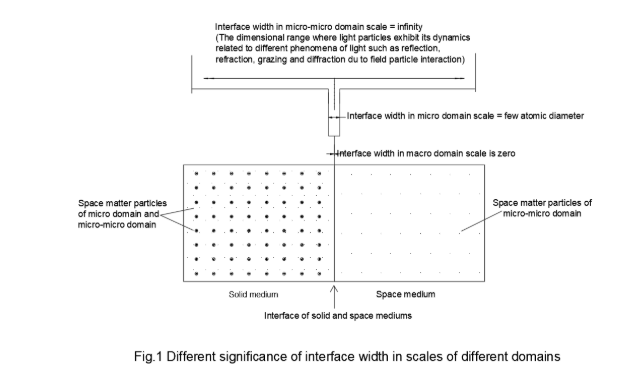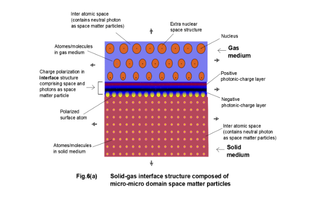 On the other hand, the inter atomic space potential (photonic potential) in gaseous medium is low and the field is also negligible. Thus, there exists a great potential difference across the opposite faces of the interfacing medium. Hence, there exists a very high potential gradient across the thin layer of interface. The thickness of the interface in macro domain scale is zero and that in micro domain scale has a definite value and that again in micro-micro domain scale is very-very large. No micro particle (atomic/sub-atomic particle) finds a placement within the thin interface layer however the interface layer contains space matter particles in micro-micro domain (light particles) both in bound and free state. Due to potential difference across two faces of the interface zone a smooth potential gradient is expected if the medium is resistive but the medium being di-photonic (following the terminology of dielectric) a charge polarized structure appears basing upon the surface of denser medium.