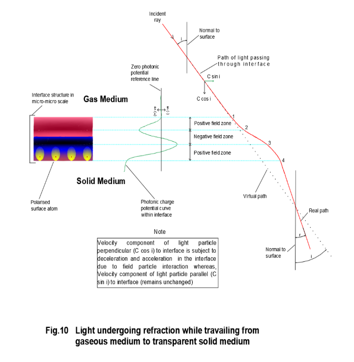 For photon conducting material (transparent material) the interface is also partially conductive, hence the polarised photonic barrier is small. Thus, light particles easily pass through the field barrier. However, the light particles in their transit through the polarised field of interface undergo field particle interaction where the velocity component of light particle normal to the interface is decelerated in the positive field and subsequently accelerated in the negative photonic field, thereby changing its direction after it passes through the interface. Referring to figure-10, the incident ray inclined at an angle i with the normal enters the interface at point ‘1’ and passes through the positive photonic field between ‘1’ and ‘2’. The normal velocity component of a light particle gradually reduces while passing through the positive photonic field. Hence the magnitude and the direction of the resultant velocity of light particles changes. Thereafter, the light particle enters into the zone of negative photonic field where the normal component of the velocity is accelerated between the points ‘2’ and ‘3’.