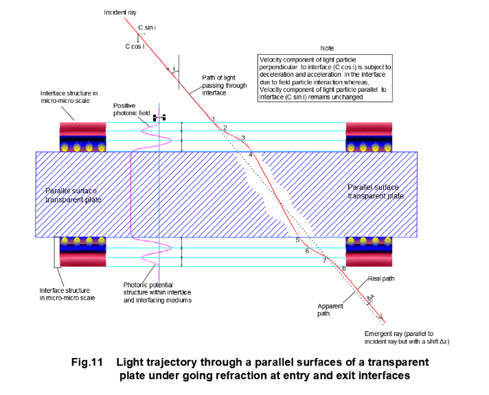 The light particles passing through a parallel transparent material plate experiences both rarer medium to denser medium and denser medium to rarer medium at entry and exit of the parallel plate (Fig.11). The field structure of interface at entry and exit points of a given transparent material being same, the emergent ray becomes parallel to the incident ray with an offset of ∆x. The transit of light particle from rarer medium to denser medium causing refraction is explained by classical dynamics through field particle interaction as it moves from point ‘1’ to ‘4’ and again, the transit from denser to rarer medium is explained by field particle interaction during its motion from point ‘5’ to ‘8’.