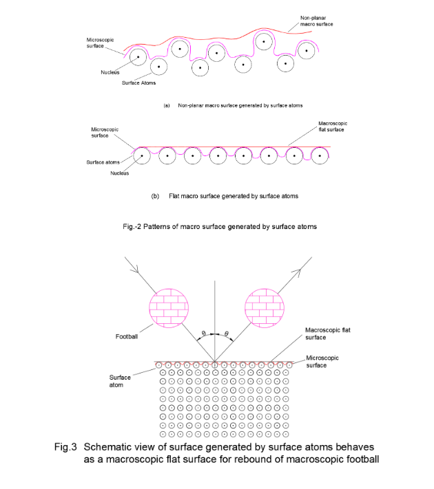A football with spherical surface in macro scale can rebound from a flat macro surface made of atoms obeying the law of rebound i.e. the angle of approach equal to the angle of rebound (Fig.3).