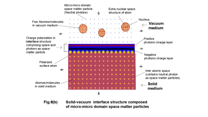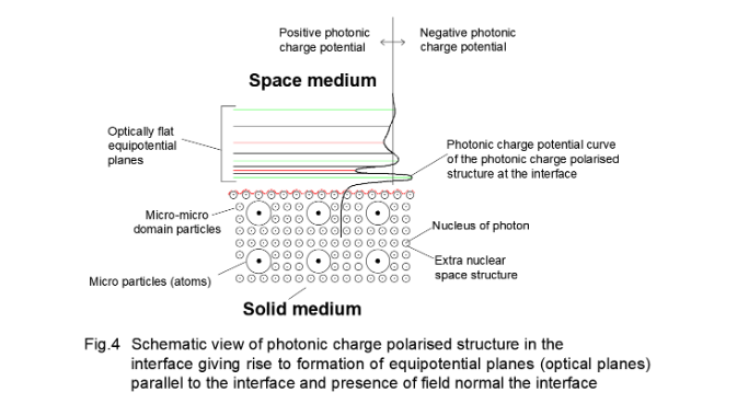 The surface states and polarization produce localized electric fields responsible for surface potential barriers (Schottky barriers). These fields are extremely localized (typically over a few angstroms) and give rise to a surface potential barrier [10]. In the new three domain structure of solid, the surface photons of micro-micro domain structure may be anticipated to produce photonic charge polarized fields at the interface. Like the surface electric field, the photonic field may be considered localized that gives rise to the formation of a photonic charge field barrier at the surface/interface. The flat macroscopic surface generated by the micro particles of micro structure is rough in micro domain scale. Similarly, the flat microscopic surface generated by micro-micro particles of micro-micro structure is rough in micro-micro domain scale and the flat micro-micro structure is rough in micro-micro domain scale. But the photonic equipotential planes within the photonic field remain optically flat in micro-micro domain scale.