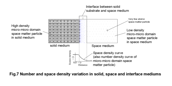 The thickness of the structured interface in micro-micro domain scale is quite large to visualize the fine structures of the interface and the field present in it. The interface structure is different from the structure of dense solid phase and the structure of gaseous phase or vacuum. Few atomic layers in both the interfacing mediums are also affected due to the strong field at the interface. The space density and the number density of the space matter particles vary spatially within the interface (Fig.7).