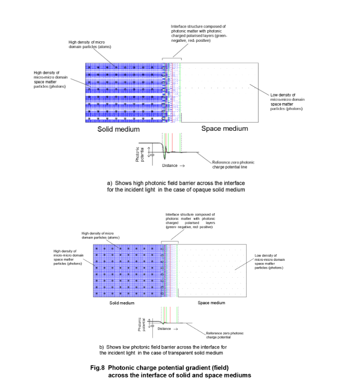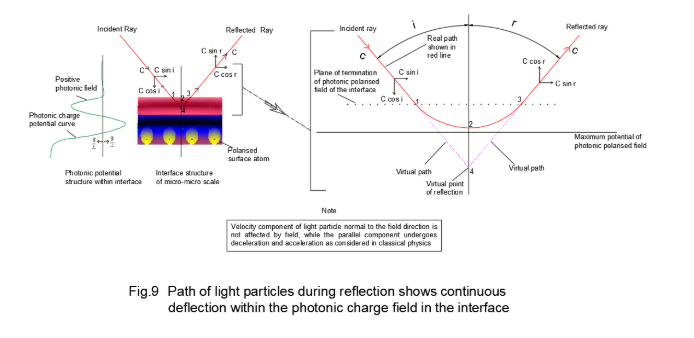 For a transparent material, the potential difference across the interface is relatively small where the polarised field barrier is weak. The polarized photonic structure in the interface zone of opaque and transparent materials is shown in Fig.8. The positively charged light particles while entering normal to the interface experiences repulsion from the positive photonic charge field in addition to the drag forces of the medium. Hence, light particles of different energy levels penetrate to different depths in the interface before its velocity becomes zero. Thereafter, the light particle reverses its direction due to field effect. The normal incident ray is reflected back normal to the surface.
